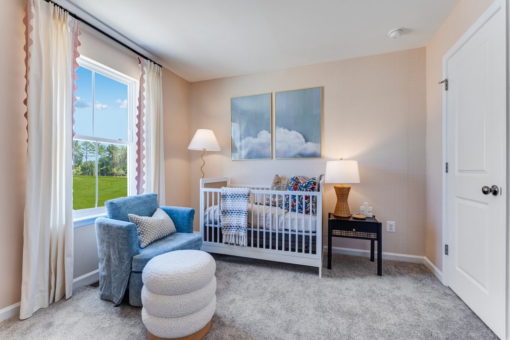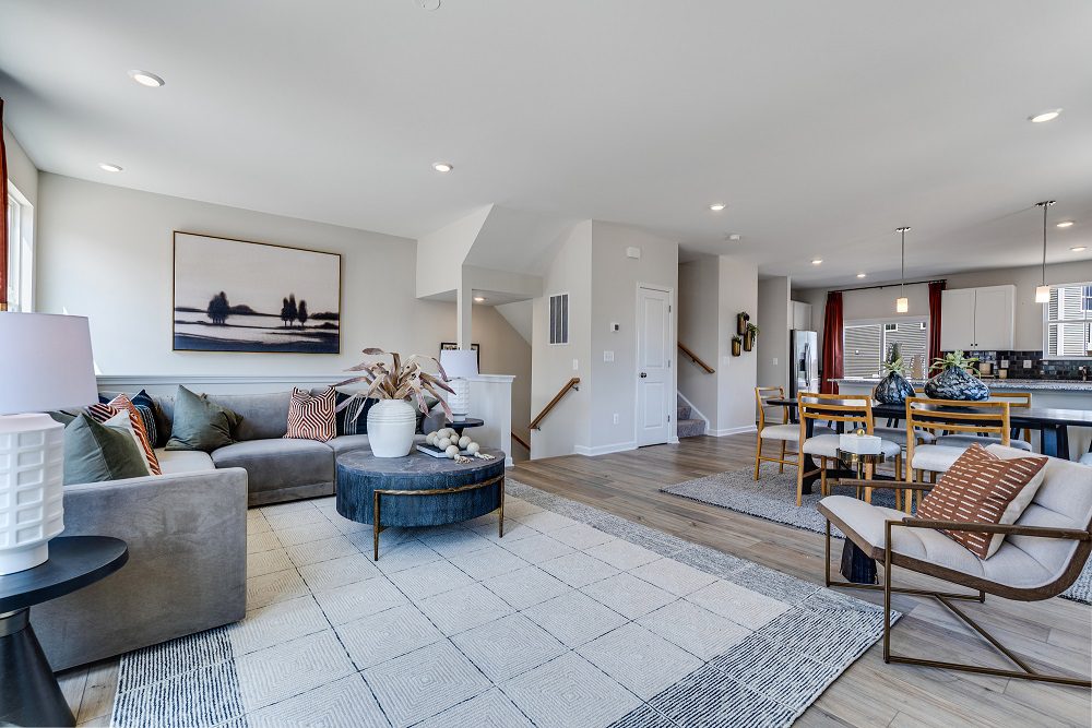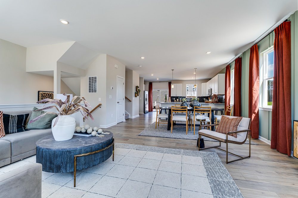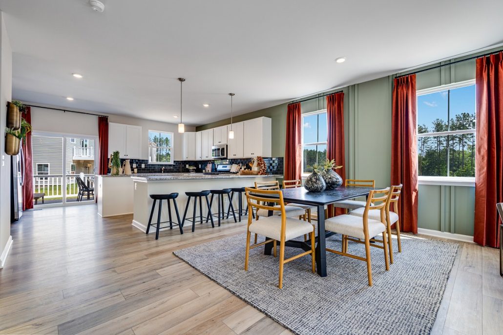 This townhome for sale in Chesterfield, VA offers a flexible, modern three-story layout designed for today’s lifestyles features a flexible, modern layout designed for today’s lifestyles. The entry level offers a spacious recreation room, ideal for a home office, gym, or media space. On the main living level, enjoy an open-concept design that seamlessly connects the Great Room, dining area, and gourmet kitchen with linen cabinetry and Carmel Fantasy countertops.